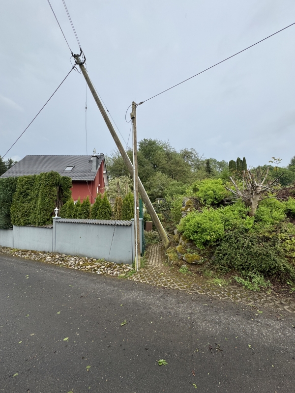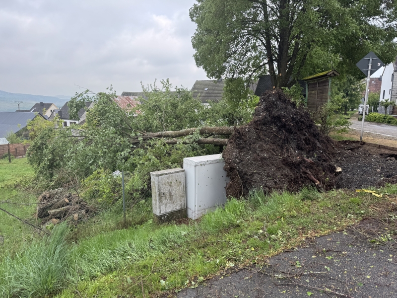 In Berzhahn haben Sturmböen ein Dach abgedeckt, ein Strommast abgebrochen und mehrere Bäume entwurzelt - sowohl im Ortsgebiet als auch entlang der L-302 Richtung Willmenrod und der L-321 Richtung Wilsenroth. Um die Schäden beseitigen zu können, musste hier neben den Ortswehren auch die Drehleiter aus Westerburg eingesetzt werden.