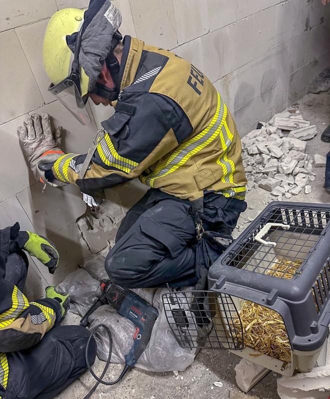 Für die weitere Rettung war schweres Gerät erforderlich. Der nachalarmierte Rüstwagen der Hauptfeuerwache brachte das erforderliche Werkzeug zur Einsatzstelle. Mit einem schweren Abbruchhammer wurde ein Teil der Wand geöffnet. Anschließend schützten die Einsatzkräfte das Tier mit einer Decke, um es vor weiteren Erschütterungen zu bewahren.