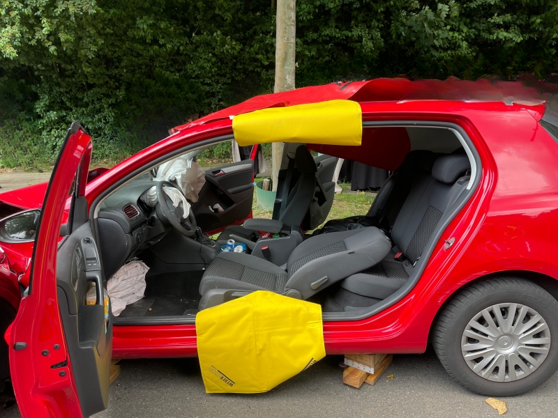 Nach der ersten Untersuchung entschied die Notärztin gemeinsam mit dem Einsatzleiter der Feuerwehr, eine technische Rettung durchzuführen, um die Frau schonend aus ihrem Fahrzeug zu retten. Mithilfe des Schneid- und Spreitgerätes wurde eine so genannte große Seitenöffnung geschaffen. Das bedeutet, dass die Türen mit dem Spreitzer heraus gespreizt werden und anschließend die mittlere Säule herausgetrennt wird.