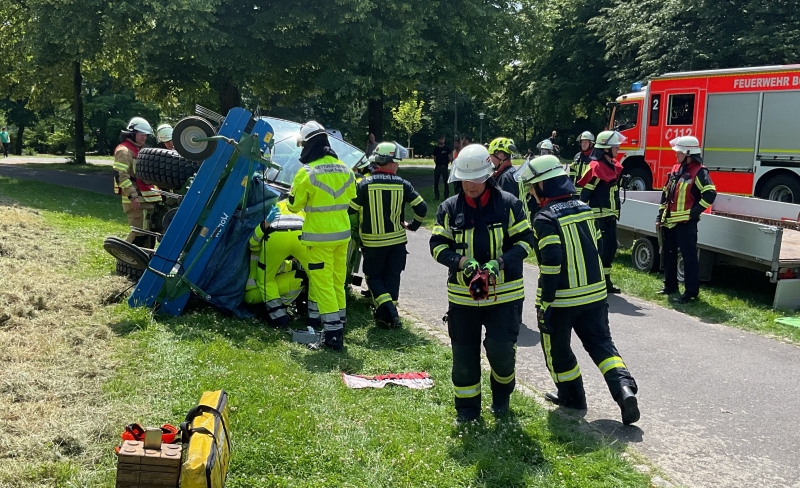 Am Donnerstagmittag wurde die Feuerwehr Bonn in die Beueler Rheinaue alarmiert. Der Grund des Einsatzes war ein Arbeitsunfall, bei dem ein Arbeiter unter einem umgestürzten Traktor eingeklemmt wurde. Vor Ort stellten die Einsatzkräfte fest, dass der Arbeiter durch seine Kollegen und anwesende Passanten aus seiner Einklemmung befreit wurde indem diese mit reiner Muskelkraft den Traktor ein Stück angehoben haben. Durch die Kräfte des Rettungsdienstes wurde die Person, die sich noch im Fahrerhaus befand medizinisch versorgt. Durch den Ausbau des Heckfensters konnte der Arbeiter dann zügig aus seiner Zwangslange befreit werden. Der verletzte Arbeiter wurde zur weiteren medizinischen Versorgung in ein örtliches Krankenhaus transportiert. Die Polizei ermittelt nun den genauen Unfallhergang. Die Bergung des verunglückten Traktors übernimmt der Betreiber selbst. Im Einsatz waren circa 35 Einsatzkräfte der Feuerwachen 1 und 2, der Freiwilligen Feuerwehr Bonn-Oberkassel sowie des Rettungs- und Führungsdienstes.