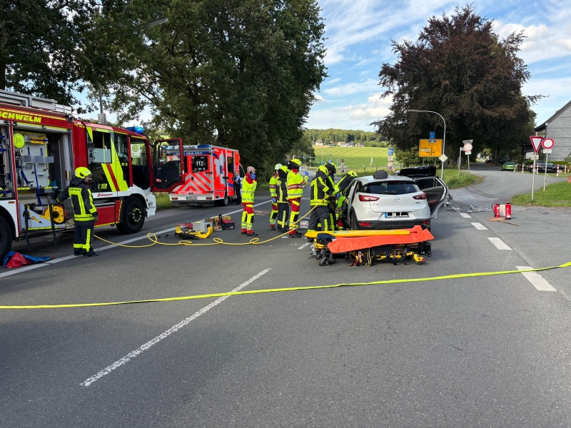 Am Samstagnachmittag (06.09.2025) wurden Feuerwehr und Rettungsdienst zu einem Verkehrsunfall auf der Hattinger Str. in Höhe der Einmündung Heidestr. alarmiert. Vor Ort fanden die Einsatzkräfte zwei schwer beschädigte PKW. In einem Fahrzeug befand sich noch eine Person, der Fahrer des 2. PKW konnte diesen noch selbständig verlassen. Die ersteintreffenden Einsatzkräfte forderten sofort weitere Kräfte nach.