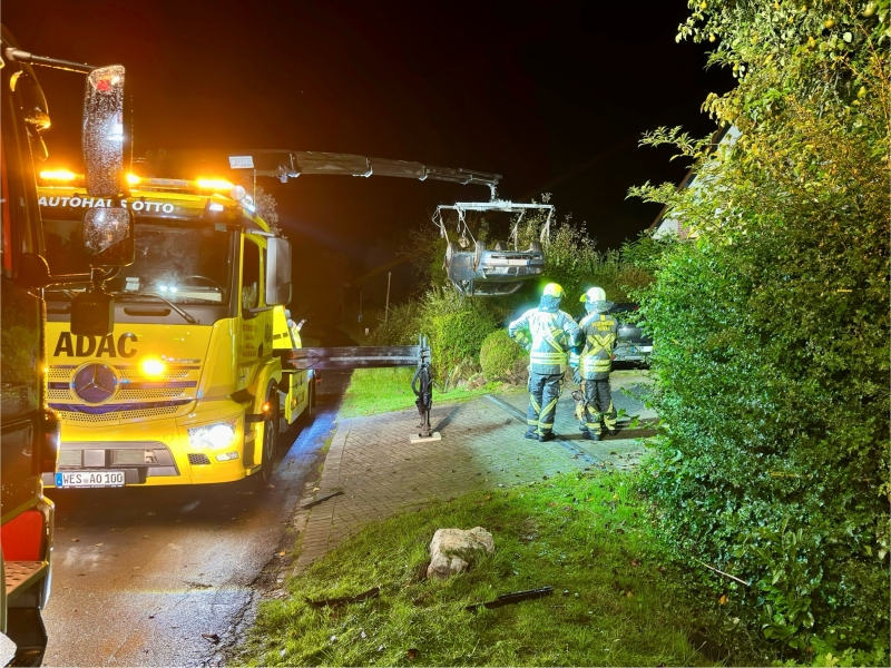 An der Einsatzstelle war ein Pkw von der Fahrbahn abgekommen, hatte sich überschlagen und lag anschließend auf dem Dach im Vorgarten eines Hauses. Bei dem Unfall wurde außerdem ein Telefonmast beschädigt. Der anfängliche Gasgeruch, aufgrund dessen die Feuerwehr nachalarmiert wurde, bestätigte sich nicht. Die Einsatzstelle wurde gegen den fließenden Verkehr abgesichert und der Brandschutz sichergestellt. Der Rettungsdienst hat die vier Insassen des Pkw gesichtet; alle waren unverletzt und konnten die Unfallstelle eigenständig verlassen. Der Telefonmast wurde mit einer Kettensäge abgetrennt und das Kabel durchtrennt, um die Bergung des Unfallfahrzeugs zu ermöglichen. Der Einsatz war nach ca. zwei Stunden beendet.