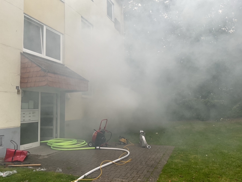 Am heutigen Sonntag wurde die Feuerwehr Dortmund gegen 18 Uhr zu einem Kellerbrand in der Mergelkuhle 39 alarmiert. Beim Eintreffen der ersten Kräfte konnte deutlich Rauch aus einem Kellerfenster des viergeschossigen Mehrfamilienhaus wahrgenommen werden. Beim Eintreffen der Feuerwehr hatten bereits alle Bewohner das Gebäude selbstständig verlassen. Sofort gingen die Einsatzkräfte mit einem Trupp unter Pressluftatmer und Strahlrohr in dem betroffenen Kellerbereich vor. Dabei wurde der Hausflur mittels Hochleistungslüfter unter Überdruck gesetzt, damit sich die giftigen Rauchgase nicht über den Treppenraum in die Wohnungen ausbreiten konnte. Der Brandherd konnte schnell ausgemacht und bekämpft werden. Anschließend wurden diverse Einrichtungsgegenstände des Kellers ins Freie verbracht und dort abschließend abgelöscht.