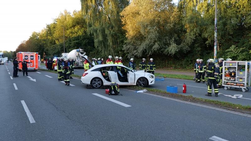 Heute Morgen um 7:25 Uhr wurde die Feuerwehr Dortmund zu einem Verkehrsunfall auf der Dorstfelder Allee in Höhe der Höfkerstraße gerufen. Hier kam es zu einem Zusammenstoß zwischen einem PKW und einem LKW. Dabei kam der PKW auf dem schmalen Grünstreifen zu stehen und ragte mit dem Heck in den Gegenverkehr. Der Fahrer war in seinem Fahrzeug eingeschlossen und musste von der Feuerwehr schonend befreit werden. Er wurde anschließend in ein Krankenhaus gefahren. Der Fahrer des LKW, ein Betonmischer, wurde nicht verletzt.
