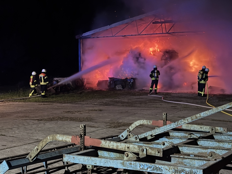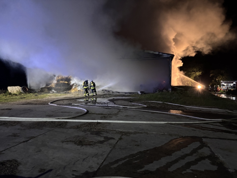 In den frühen Morgenstunden des 24. September 2025 wurden mehrere Feuerwehren gegen 2 Uhr zu einem Brand eines landwirtschaftlichen Gebäudes alarmiert. Beim Eintreffen der ersten Kräfte stand eine Scheune, in der hauptsächlich Stroh gelagert war, bereits in Vollbrand. Das Gebäude befand sich im hinteren Bereich eines größeren landwirtschaftlichen Betriebes.