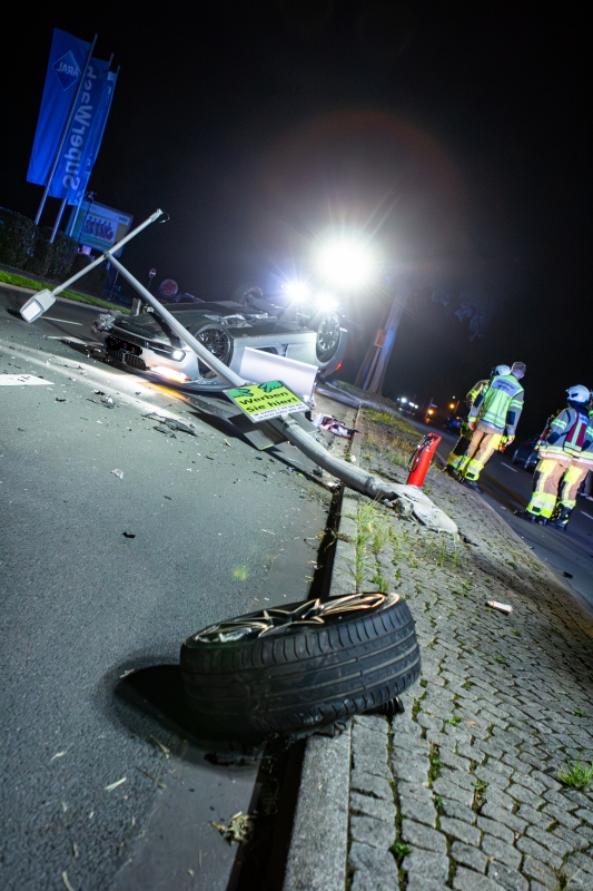 Gegen 22:20 Uhr befand sich ein Angehöriger der Berufsfeuerwehr mit seinem Einsatzfahrzeug an einer Tankstelle auf der Dortmunder Straße, als sich hinter ihm auf der stadteinwärts führenden Fahrspur ein silberner BMW überschlug. Der Feuerwehrmann eilte sofort zu dem verunfallten Fahrzeug und alarmierte zeitgleich über den Notruf seine Kollegen.
