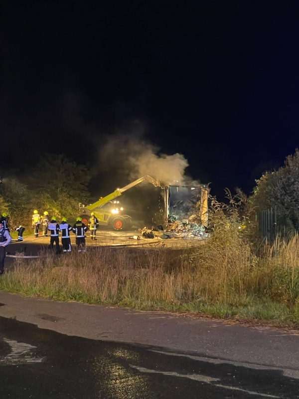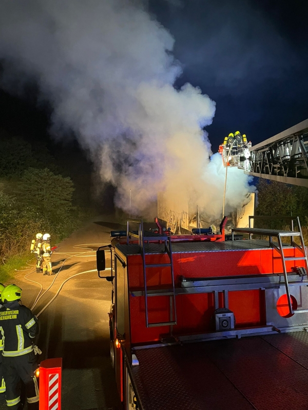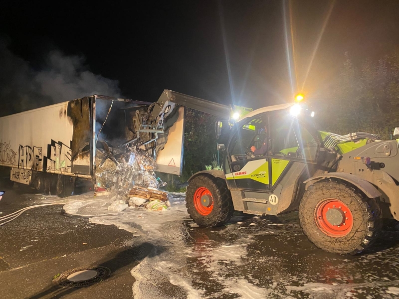 Zur weiteren Brandbekämpfung und Entladung des betroffenen Aufliegers, der mit Kunststoffgranulat beladen war, ein Teleskoplader angefordert. Damit konnte die Ladung schrittweise entfernt und der Brand gezielt abgelöscht werden. Zwischenzeitlich löschten die Einsatzkräfte auch von oben über den Korb der Drehleiter. Die Nachlöscharbeiten zogen sich bis in die frühen Morgenstunden hin. Gegen 06:00 Uhr konnte die Einsatzstelle an die Polizei übergeben und der Einsatz für die Feuerwehr beendet werden.