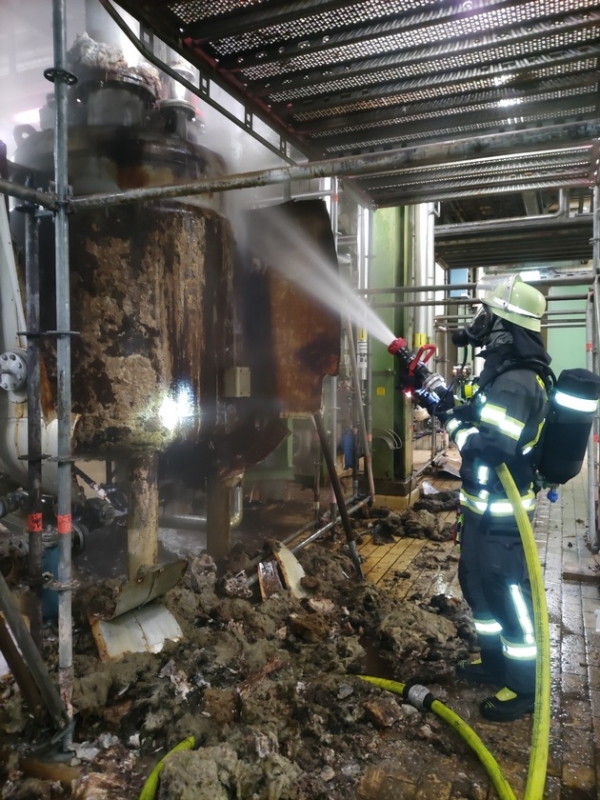 Vor Ort rückten sowohl die städtische Feuerwehr als auch die Betriebsfeuerwehr des Unternehmens aus. Insgesamt waren rund 70 Einsatzkräfte beteiligt, darunter vier Atemschutztrupps, die mit C-Rohren gegen die Flammen vorgingen. Die Isolierung des betroffenen Behälters wurde entfernt und gezielt abgelöscht, um eine Ausbreitung des Feuers auf angrenzende Produktionsbereiche zu verhindern.