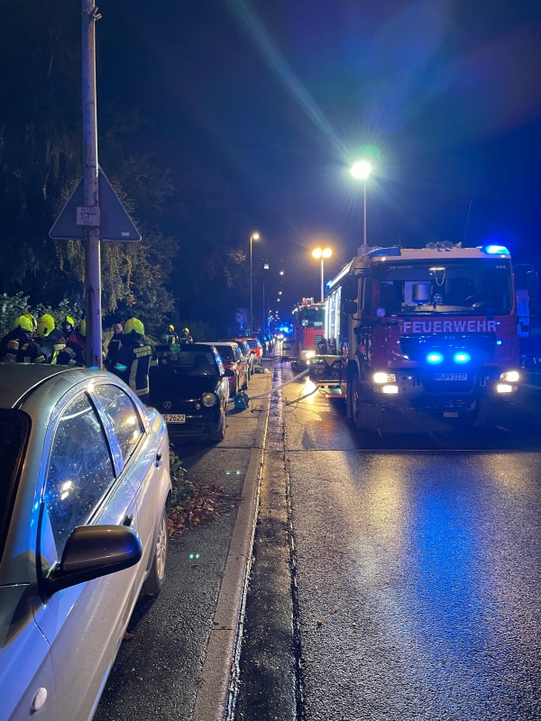 Bergheim - Gegen 21:50 Uhr rückte die Feuerwehr Bergheim am Samstagabend (04.10.) zum Lohweg nach Bergheim-Niederaußem aus. In einem Mehrfamilienhaus war ein Feuer im Keller ausgebrochen. Eine massive Rauchentwicklung verhinderte zeitweise, dass einige Bewohnerinnen und Bewohner das Gebäude verlassen konnten. Drei Feuerwehrleute wurden während der Löscharbeiten verletzt. Eine Bewohnerin wurde mit dem Verdacht auf eine Rauchgasvergiftung in ein Krankenhaus gebracht.