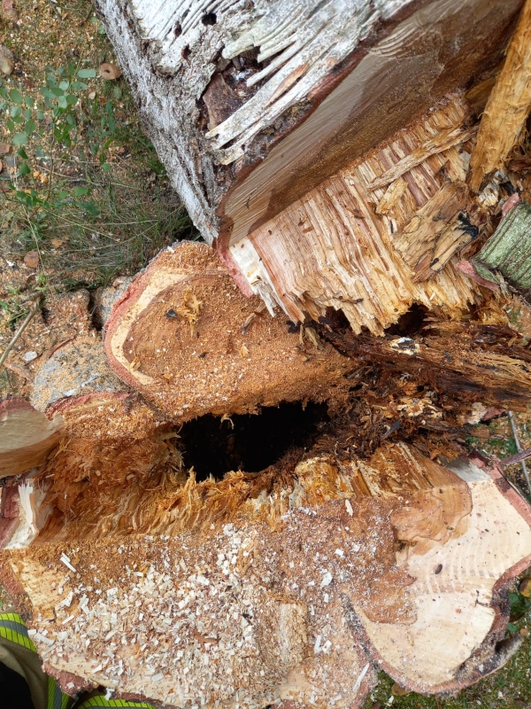 Nach der ersten Erkundung durch die Einsatzkräfte bestätigte sich die Lage: Eine etwa 50 Zentimeter starke Birke hatte sich bereits im Erdreich gelockert und neigte sich gefährlich in Richtung des Gebäudes. Um eine akute Gefahr für Personen und Sachwerte abzuwenden, wurde der Baum zunächst mittels eines Mehrzweckgreifzuges gesichert. Anschließend erfolgte eine kontrollierte Fällung: Mit der Motorsäge wurde der Stamm angekerbt und die Birke über den Greifzug gezielt vom Gebäude weggezogen.
