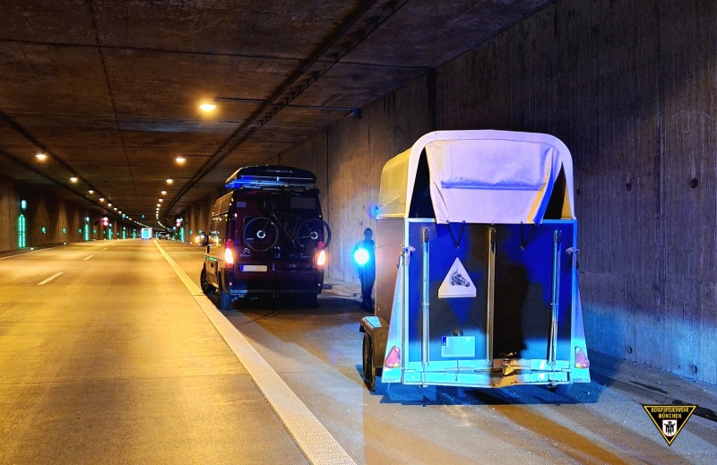 Ein Pkw mit Pferdeanhänger ist am Samstagnachmittag mit defekter Deichsel im Aubinger Tunnel Richtung Salzburg liegengeblieben. Bei Eintreffen der Einsatzkräfte der Feuerwehr München stellte sich heraus, dass sich in dem Anhänger acht Strauße befanden. Da die Tiere alle unverletzt waren, aber sichtlich unter Stress standen, wurde seitens der Feuerwehr entschieden, den Anhänger zügig aus dem Tunnel zu fahren. Mittels Spanngurten wurde er an das Zugfahrzeug gekoppelt und anschließend in Begleitung eines Einsatzfahrzeuges langsam aus dem Tunnel gefahren. Schließlich konnten die Tiere und deren Besitzer in ruhigerer Umgebung auf den Abschleppdienst warten.