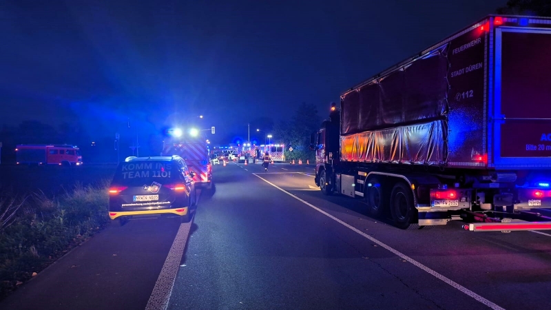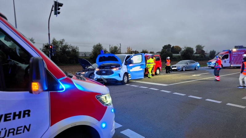 Die Feuerwehr Düren wurde am Mittwochmorgen um 7:04 Uhr zu einem Verkehrsunfall auf der B264 in Höhe der Ortslage Derichsweiler alarmiert. Auslöser war ein E-Call, ein automatisches Notrufsystem, das bei schweren Verkehrsunfällen selbstständig einen Notruf absetzt. Weitere Notrufe bestätigten den Unfall und meldeten mehrere beteiligte Fahrzeuge sowie verletzte Personen.