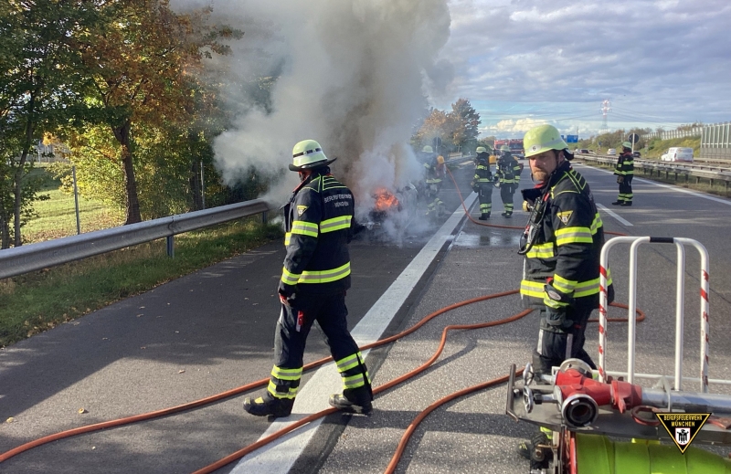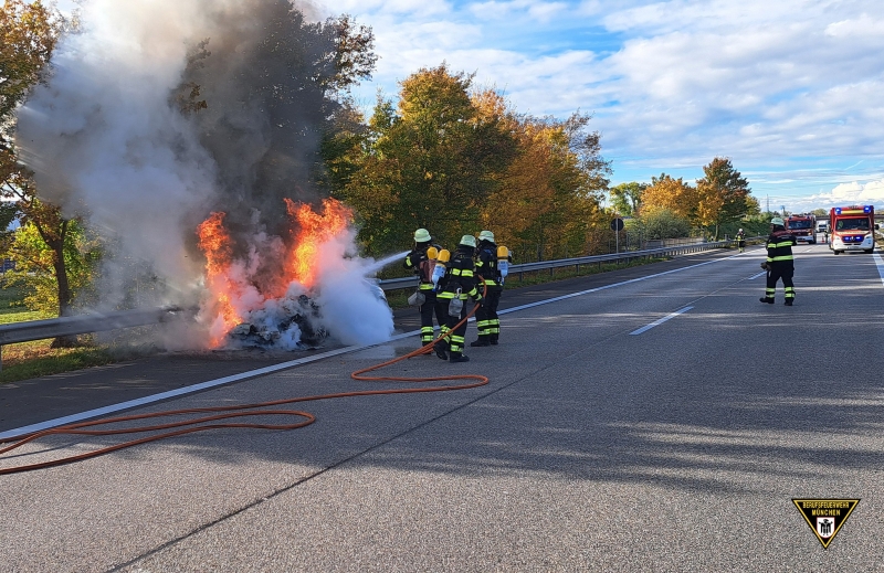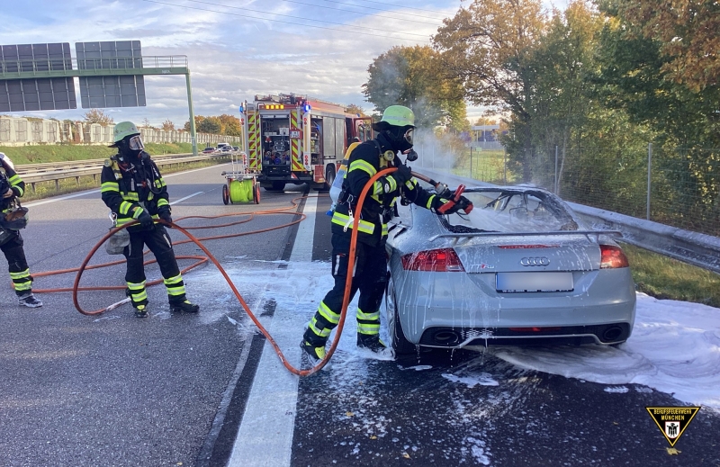 Der Audi TT, der in Fahrtrichtung München unterwegs war, fing kurz nach dem Autobahnkreuz München-West aus noch unbekannter Ursache Feuer. Der Fahrer konnte das Fahrzeug auf dem Standstreifen anhalten, sich hinter der Leitplanke in Sicherheit bringen und die Feuerwehr verständigen. Die anrückenden Einsatzkräfte stellten bereits auf der Anfahrt eine starke Rauchentwicklung fest. Beim Eintreffen an der Einsatzstelle hatte die Polizei den Verkehr schon zum Stehen gebracht und der Pkw stand in Vollbrand. Drei Einsatzkräfte unter Atemschutz gingen unmittelbar zur Brandbekämpfung mit dem Schnellangriffsschlauch eines Hilfeleistungslöschfahrzeuges vor. Diese Vorrichtung ist direkt mit dem Wassertank des Fahrzeuges verbunden und für Einsätze dieser Art bestens geeignet. Im weiteren Verlauf wurde auch Löschschaum eingesetzt, der mit seiner erstickenden Wirkung auch letzte verborgene Glutnester ablöschen kann.