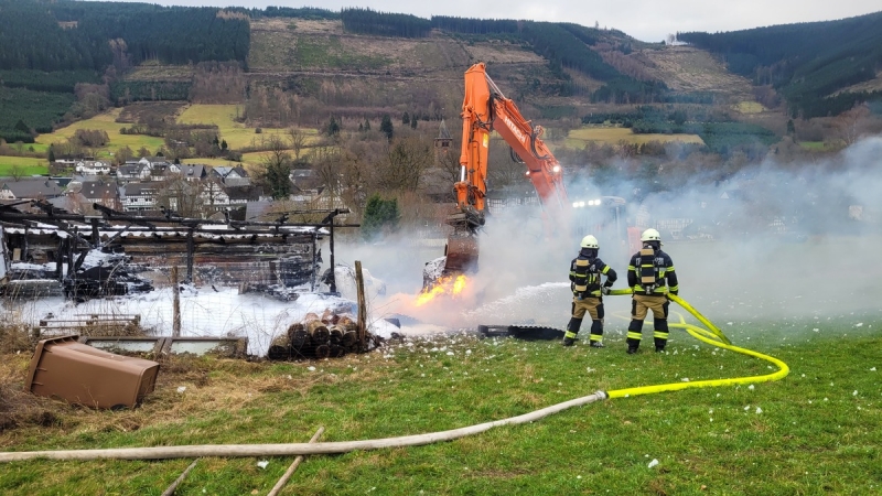 Die Feuerwehr Lennestadt wurde heute gegen 11:30 Uhr zu einem Feuer 3 - Scheunenbrand nach Lennestadt-Saalhausen alarmiert. Beim Eintreffen der ersten Einsatzkräfte stand die Scheune bereits in Vollbrand. Umgehend wurde ein Löschangriff eingeleitet, durch den das Feuer schnell unter Kontrolle gebracht werden konnte. Aus dem Gebäude konnte zudem eine Gasflasche in Sicherheit gebracht und gekühlt werden. Trotz der schnellen Maßnahmen brannte die Scheune während der Löscharbeiten nahezu vollständig bis auf das Grundgestell nieder. In dem Gebäude befanden sich unter anderem ein Traktor sowie Stroh, welche ebenfalls vom Feuer erfasst wurden. Im weiteren Einsatzverlauf wurde die Brandfläche mit einem Schaumangriff benetzt, um ein Wiederaufflammen zu verhindern. Zusätzlich wurde ein Bagger zur Einsatzstelle geordert, mit dem das Brandgut auseinandergezogen wurde, um verbliebene Glutnester gezielt ablöschen zu können.