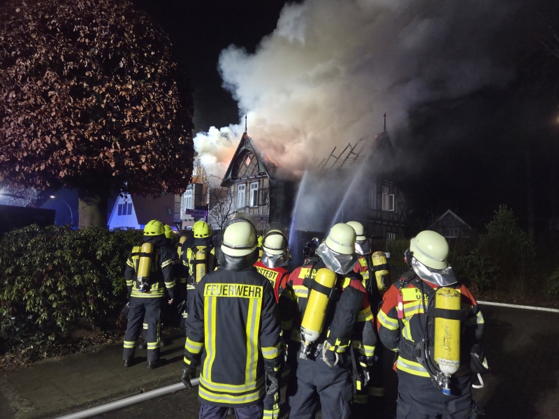 Beim Eintreffen der Feuerwehr stand ein Großteil des Gebäudes bereits in Vollbrand. Insbesondere aus dem Dachstuhl schlugen offene Flammen, eine starke Rauchentwicklung war weithin sichtbar. Aufgrund der Lage und der Brandausdehnung wurde das Alarmstichwort frühzeitig erhöht und zahlreiche weitere Kräfte nachalarmiert.