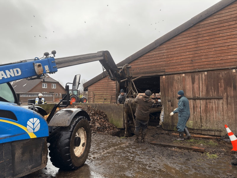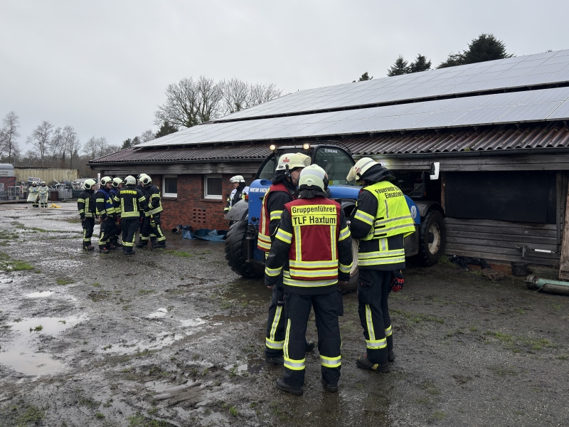 Über mehrere Stunden hat eine Großtierrettung am Silvestervormittag die Feuerwehren Haxtum und Sandhorst im Auricher Ortsteil Rahe gefordert. Bei der Regionalleitstelle in Wittmund war gegen 10:20 Uhr der Notruf eines Landwirts eingegangen, der beim Betreten seines Stallgebäudes feststellte, dass zwei Kühe in den darunterliegenden Güllekeller durchgebrochen waren. Die Tiere steckten bis zum Hals in der Jauchemasse und wirkten bereits völlig entkräftet, weshalb eine sofortige Rettung erforderlich wurde. Mit gut 30 Einsatzkräften rückten die beiden Ortswehren daraufhin an die Oldersumer Straße aus.