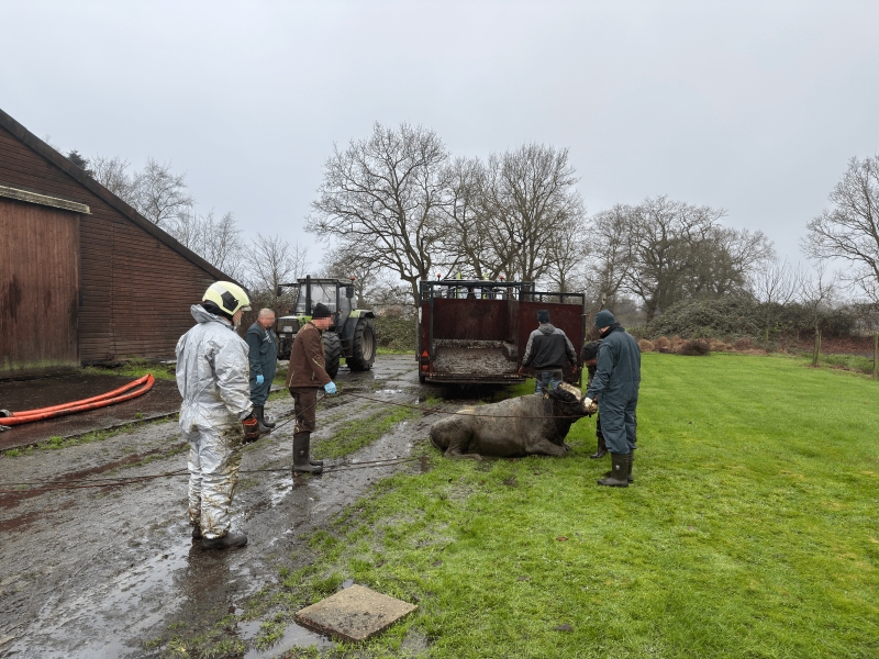 Hierdurch bot sich den Einsatzkräften nach rund einer Stunde auch die Möglichkeit, unter Atemschutz mit Wathosen ausgerüstet in den Kellerschacht vorzugehen und zunächst die genaue Position der Tiere zu bestimmen, ehe daraufhin versucht wurde, sie nacheinander zu den Ausgangsöffnungen zu treiben. Dort ist die erste Kuh gut zweieinhalb Stunden nach Beginn der Rettungsmaßnahmen festgesetzt, durch ein spezielles Geschirr fixiert und dann mittels Kleintraktor aus dem Untergeschoss gehoben worden. Das zweite Tier musste durch weitere Atemschutztrupps zum rückwärtigen Ausgang bewegt, im Anschluss ebenfalls festgebunden und schließlich durch einen Teleskoplader hochgehievt werden.