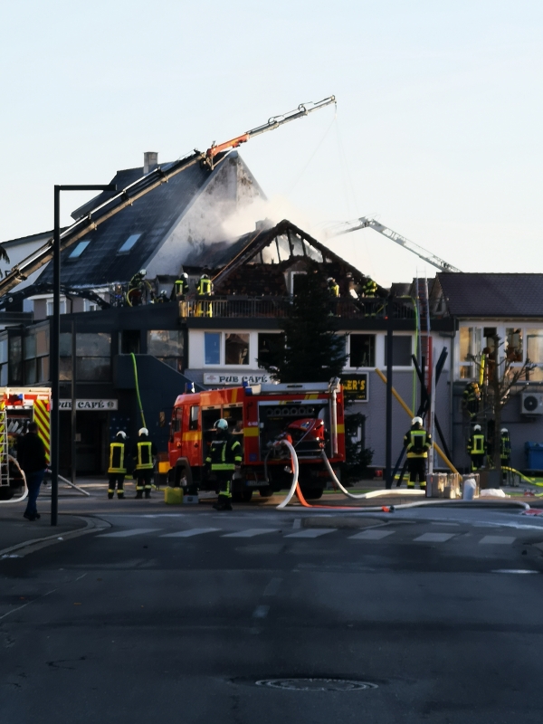 In den frühen Morgenstunden vom 01.01.2026 wurde die Feuerwehr Mengen gegen 6.35 Uhr zu einem massiven Dachstuhlbrand am Rande der Mengener Altstadt alarmiert. Beim Eintreffen der Feuerwehr stand der Dachstuhl eines größeren Wohn- und Gaststättengebäudes bereits in Vollbrand, weshalb zügig weitere Kräfte angefordert wurden. Im Gebäude befindliche Gasflaschen kamen zur Explosion und brachten weitere Gefährdungen für die Einsatzkräfte. Alle Abteilungen der Feuerwehr Mengen, ein zweiter Löschzug aus Bad Saulgau, Kräfte des Gemeindeverwaltungsverbunds Hohentengen und Scheer sowie der Einsatzleitwagen2 aus Sigmaringen und ein Katastrophenschutz-Löschfahrzeug aus Veringenstadt wurden nachalarmiert. Die Brandausbreitung konnte durch die Einsatzkräfte rasch eingedämmt werden. Derzeit sind insgesamt mehr als 180 Rettungskräfte im Einsatz. Es gibt zum Glück aktuell keine verletzten Personen. Das DRK ist ebenfalls mit mehreren Kräften vor Ort und übernimmt die Betreuung der Anwohner im Rettungszentrum Mengen sowie die Versorgung der Einsatzkräfte vor Ort. Die Löscharbeiten dauern zum aktuellen Zeitpunkt noch an. Zur Brandursache liegen aktuell keine Informationen vor. Es geht keine Gefahr für die Anwohner oder für die Bevölkerung aus. Kommandant Seeger gab an, er sei mit der geleisteten Arbeit der Einsatzkräfte höchst zufrieden. Auch der Kreisbrandmeister Michael Reitter sowie der stellvertretende Bürgermeister Georg Bacher lobten das gute Vorgehen der Einsatzkräfte an diesem Neujahrsmorgen.