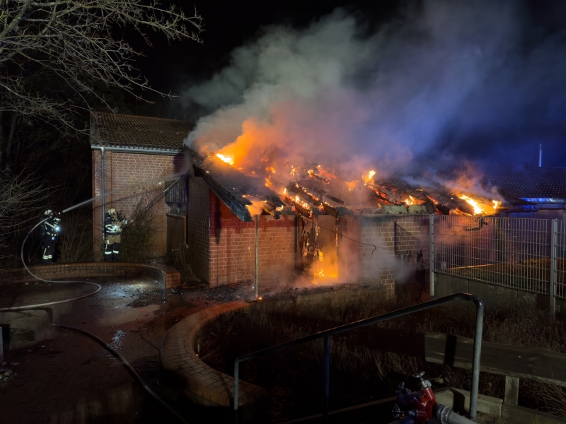 Heute, 2.1.2026, gegen 0:20 Uhr, meldete eine Zeugin Feuerschein im Bereich der Sporthalle neben der Waldschule an der Parkstraße. Als erste Polizeikräfte wenige Minuten später vor Ort eintrafen, befand sich der Eingangsbereich der Sporthalle bereits im Vollbrand. Durch die Feuerwehr konnte ein Übergreifen der Flammen auf die eigentliche Sporthalle verhindert werden. Sie ist aber durch Rauch und Löschwasser in Mitleidenschaft gezogen worden und zunächst nicht nutzbar. Der Dachstuhl des überdachten Eingangsbereichs brannte komplett aus. Der Sachschaden liegt nach ersten Schätzungen der Polizei im mittleren sechsstelligen Bereich.