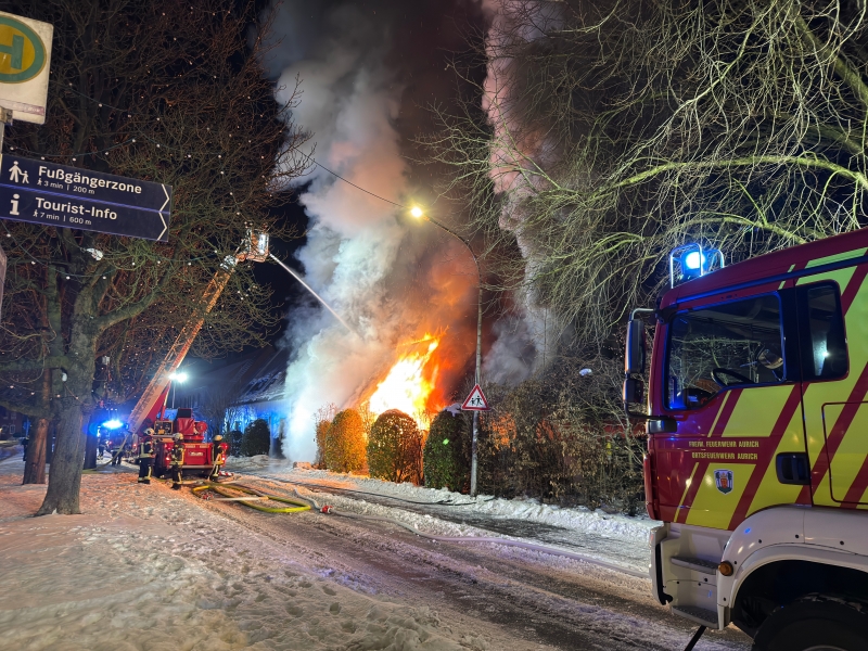 Aus einem anfänglichen Müllcontainerbrand hat sich in der Nacht zu Sonntag ein ausgedehntes Feuer am Fischteichweg entwickelt, dem ein Lagergebäude zum Opfer fiel und in Gänze zerstört worden ist. Zwischenzeitlich kämpften an die 130 Einsatzkräfte gegen die Flammen in der Auricher Innenstadt an. Ihren gemeinsamen Kraftanstrengungen ist es zu verdanken, dass sich der Vollbrand nicht auf die unmittelbar angrenzenden Gebäude eines Kindergartens sowie der Katholischen Kirchengemeinde ausbreitete. Bei Außentemperaturen von um die minus zehn Grad leisteten die Feuerwehrleute über einige Stunden absolute Höchstarbeit, wurden hierbei aber auch von vielerlei Akteuren entscheidend unterstützt.