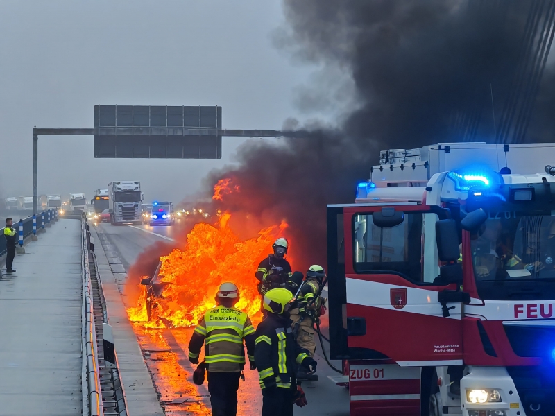 Glücklicherweise konnte der Fahrer, der den Brand während der Fahrt bemerkte, das Fahrzeug zum Stehen bringen und das Fahrzeug unverletzt verlassen. Nachfolgende Fahrzeuge konnten rechtzeitig ausweichen oder anhalten, so dass es zu keinen Folgeunfällen kam. Ein Team unter Atemschutz löschte das Fahrzeug, während der Löscharbeiten kam es zu teilweisen Sperrungen der Autobahn. Nach Abschluss der Löschmaßnahmen konnte die Einsatzstelle an die Polizei übergeben werden. Die Ursache für den Brand des Diesel-Pkw ist unbekannt.