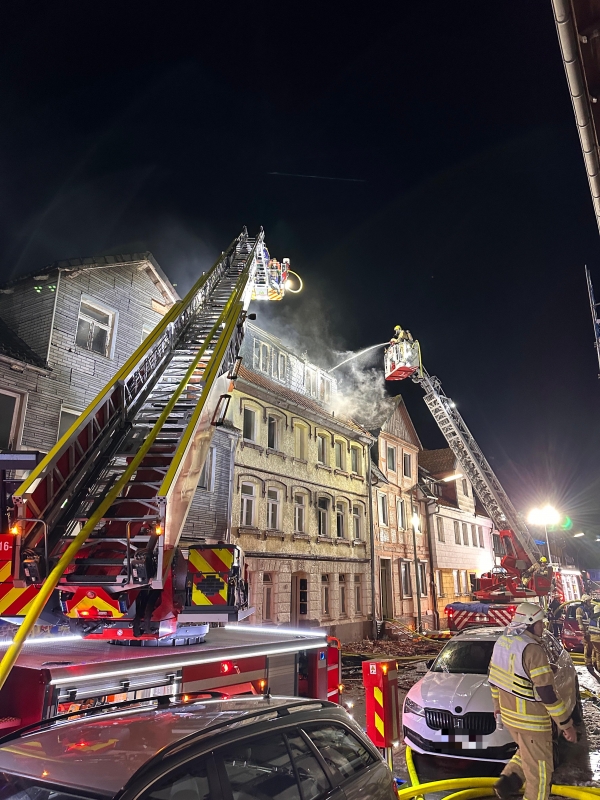 Gemeldet wurde ein Wohnungsbrand mit Menschenleben in Gefahr. Bei Ankunft des Einsatzleiters schlugen ihm bereits aus mehreren Fenstern die Flammen aus dem Gebäude entgegen. Zwei Personen waren zu diesem Zeitpunkt noch mindestens im Gebäude. Bei Eintreffen der ersten Kräfte wurde umgehend mit der Menschenrettung und Brandbekämpfung begonnen. Zwei Personen wurden mittels Drehleiter aus dem völlig verrauchten 2. OG gerettet. Parallel gingen mehrere Trupps unter Atemschutz zur Brandbekämpfung vor. Es zeigte sich jedoch schnell, dass die massive Brandausweitung auf das gesamte Gebäude übergriffen hatte, so dass ab dem 1. OG die Decken bis durch das Dach durchgebrannt waren. Ein Innenangriff war dann nicht mehr möglich. Auch der Einsatz von zwei Drehleitern (Helmstedt, Grasleben) konnte ein Durchzünden des Dachstuhls hin zu einem offenen Dachstuhlbrand nicht verhindern. Aufgrund des Einsatzverlaufes wurden umgehend weitere Einsatzkräfte nachgefordert. Zwischenzeitlich drohte das Feuer auf die benachbarten Gebäude überzugreifen, dies konnte jedoch mit einem massiven Löschangriff erfolgreich verhindert werden. Die Ortsfeuerwehr Königslutter stellte dennoch eine dritte Drehleiter zur Verfügung, um ggf. sofort reagieren zu können. Die Ortsfeuerwehren aus Wolsdorf, Samtgemeinde Velpke sowie aus Beendorf sammelten sich an der Feuerwehr Helmstedt und stellten weitere Atemschutzgeräteträger zur Verfügung. Durch die Leitstelle Helmstedt-Wolfsburg wurde eine Bevölkerungswarnung über die Warn-Apps geschaltet, aufgrund der starken Rauchentwicklung.