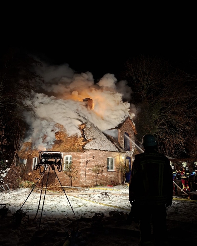 Gegen 23:40 Uhr nahmen Anwohner im Möhlenweg ein Feuer am Reetdach eines Einfamilienhauses wahr und alarmierten die Einsatzkräfte. Nach bisherigen Erkenntnissen brach aus bislang ungeklärter Ursache im Bereich eines Holzunterstandes ein Feuer aus. Dieses Feuer setzte das angrenzende Reetdach in Brand. Die Anwohner konnten das Gebäude unverletzt verlassen.