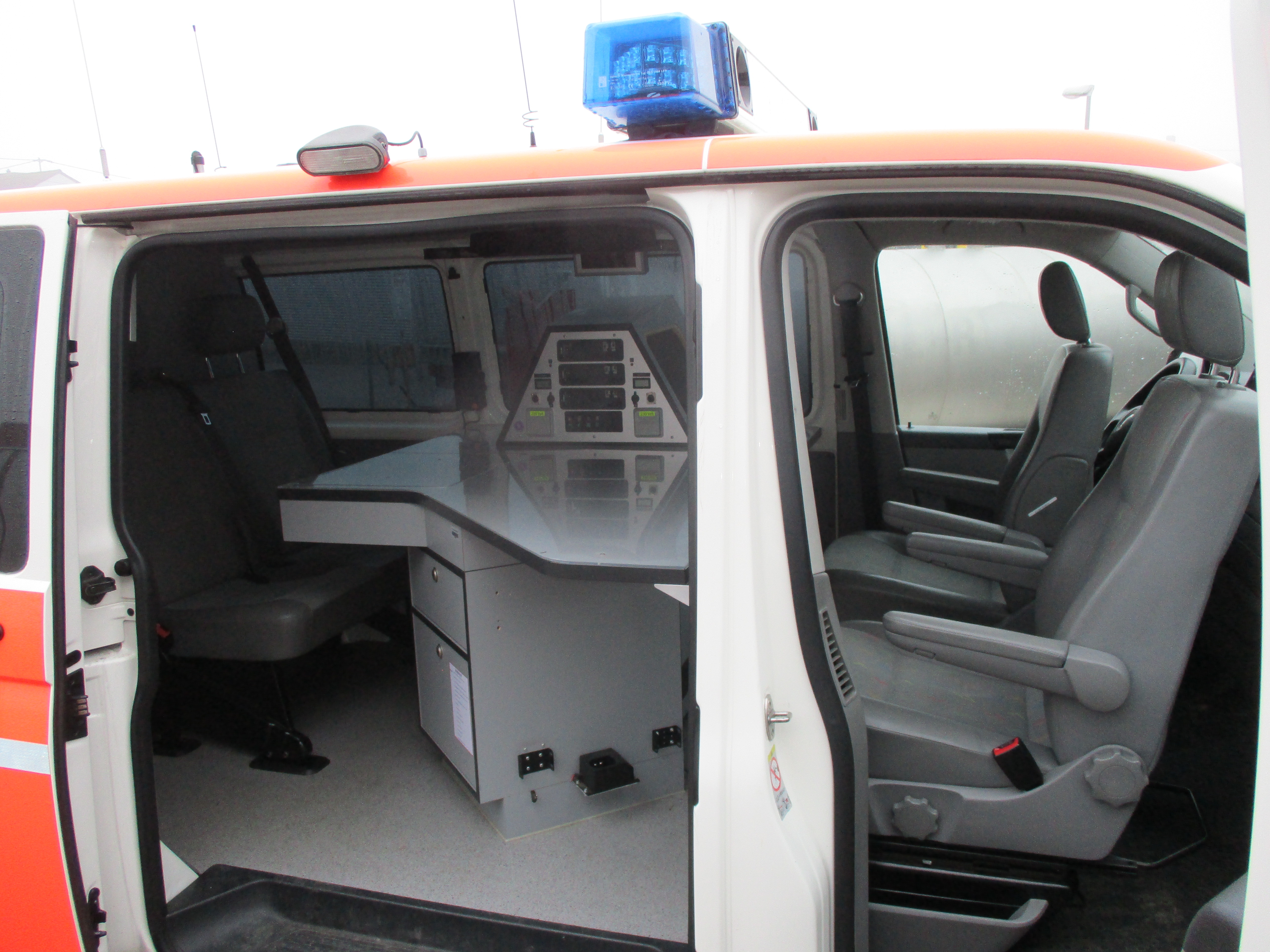 Im Kastenaufbau befindet sich ein Ausbau für ein Einsatzleitwagen 1, bestehend aus einem Arbeitsplatz mit Doppelsitzbank, diversen Schubladen und Ablagefächern.