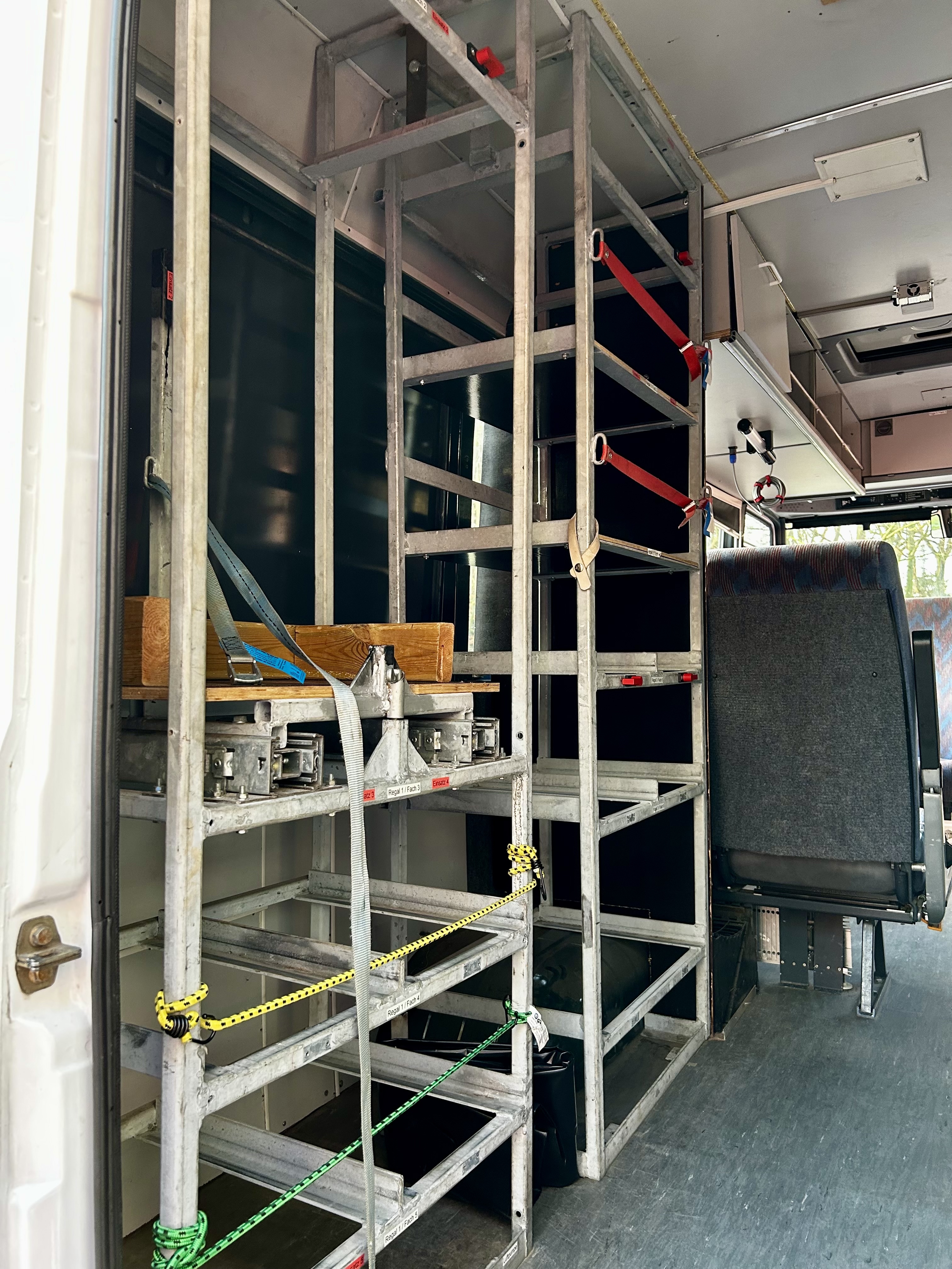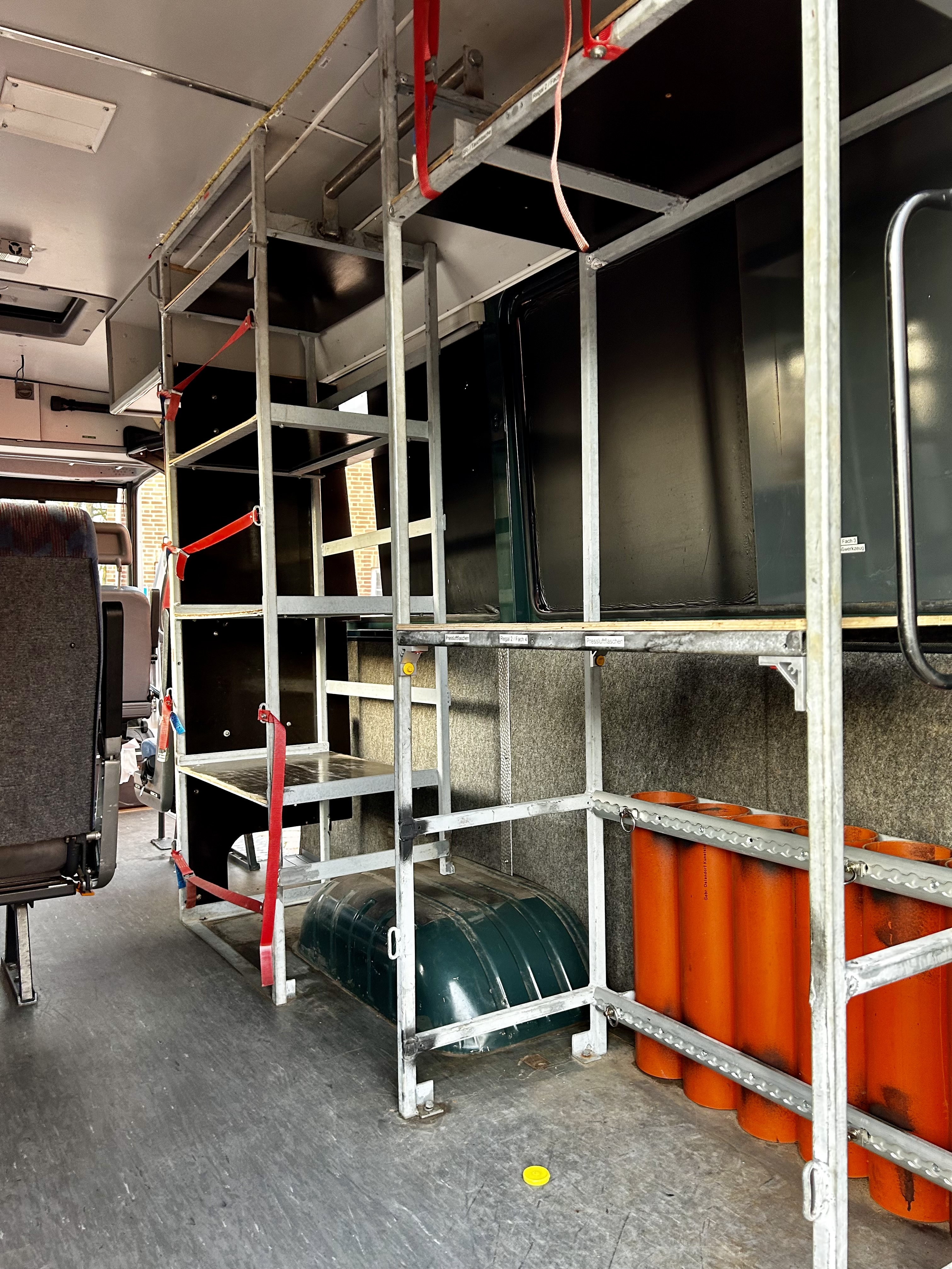 Verkauft wird der Gerätewagen ohne wasserrettungstechnische Beladung, aber mit dem aktuell verbauten Regalsystem. Aktuell sind im Fahrzeug zudem 7 von 9 Sitzen verbaut. Die zusätzlichen Sitze sind vorhanden und ebenso Gegenstand dieses Angebots. Da sie aus den Fahrzeugunterlagen nie ausgetragen wurden ist ein Einbau problemlos möglich.
