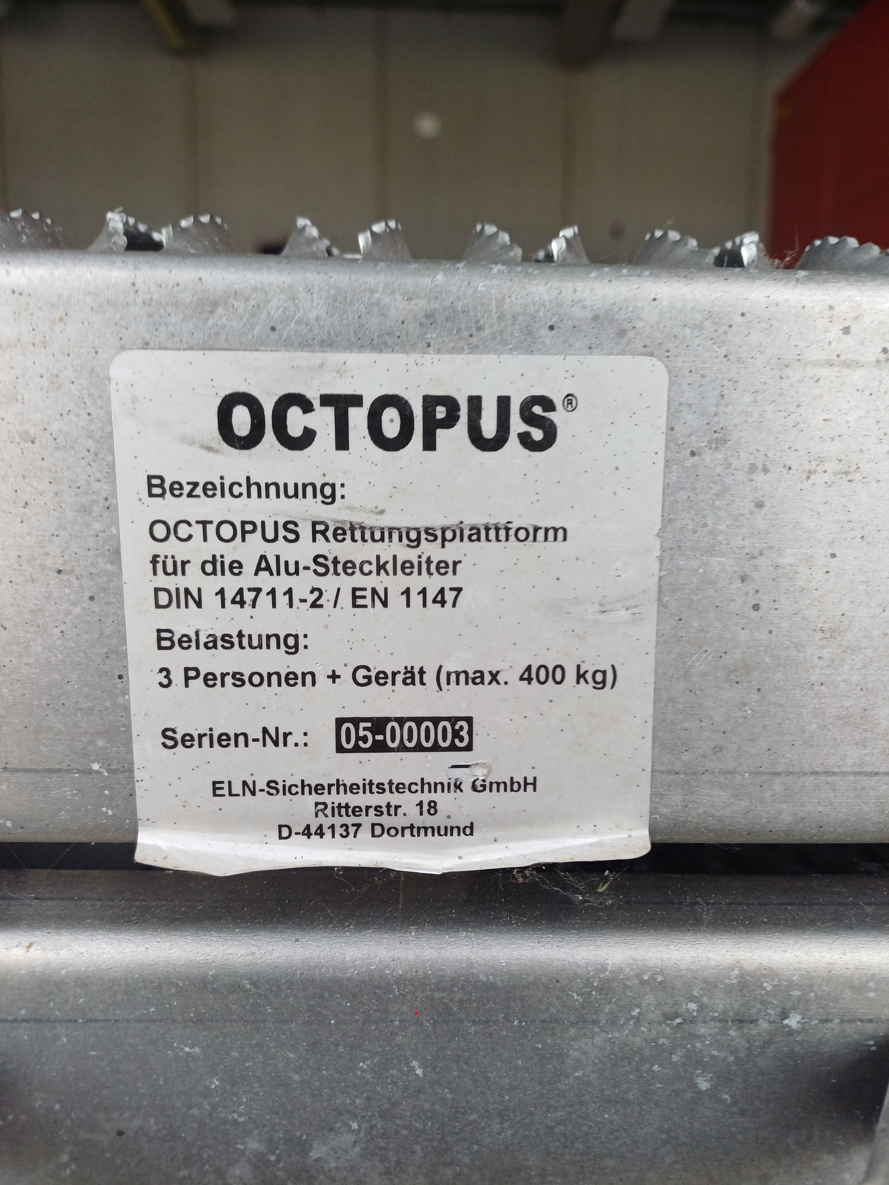Hersteller: ELT-Sicherheitstechnik Bezeichnung: OCTOPUS Rettungsplattform für die Alu-Steckleiter DIN 14711-2/ EN 1147 Anschaffung: 2020 Seriennummer: 05-00003 Maße gepackt: 187 x 55 x 21 cm Belastung: max. 400 kg (3 Personen + Gerät) Gewicht: 58 kg ohne Steckleitern Arbeitsfläche: 176 cm x 101 cm Arbeitshöhe: bis 171 cm Der Käufer ist für die Organisation des Transportes und die damit entstehenden Kosten verantwortlich 20.01.2026 Anzeige-Nr.: 100075 | ||