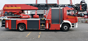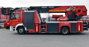 Leitersatz: 5-teilig, mit Gelenkarm, vollautomatisch, permanent montiertes Aluminiumrohr in der Oberleiter, Einhängeöse an der Korbgabel, Lastöse ermöglicht die Verwendung als Hebeeinrichtung (Hebelast: bis zu 4 t an der Unterleiter, bis zu 400 kg an der Leiterspitze)