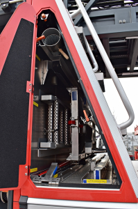 Signalanlage mit Rundumkennleuchte und Druckluftkompressorfanfare (Typ Martin), Hauptbedienstand mit Anzeige, klappbarem Dach und Sitzheizung, Aluminium-Sicherheitspodium mit 6 Geräteräumen mit Rollläden für vielfältige Ausrüstung, Rettungskorb mit abnehmbaren Multifunktionssäulen und zwei Anschlagpunkte für PSA, Krankentragehalterung 360°/endlos drehbar mit Möglichkeit zur Befestigung am Korbboden, zusätzlicher C-Abgang am Korb/Monitor, CAN-Bus-Steuerung, Stromerzeuger RS14, 400V Motor für Notbetrieb des Drehleiteraufbaus, Anschlüsse sowohl für Motorola als auch Sepura vorhanden, beheizbare Scheibenwischer, Radio