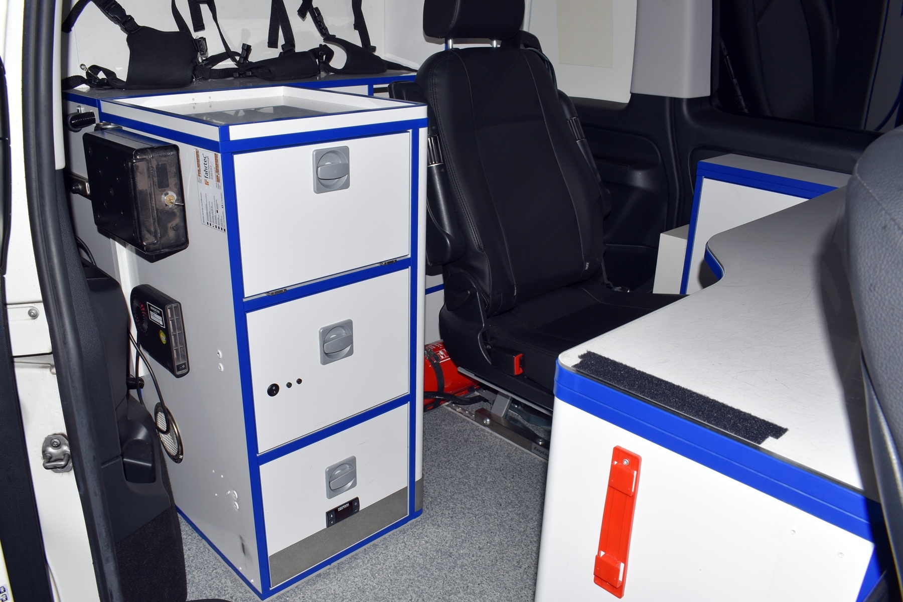 Nach DIN 75059: Druckkammerlautsprecher, Martin-Anlage, LED-Signalanlage, Unfalldatenspeicher, Thermofach, Kühlfach, Handy-Freisprecheinrichtung, Schrank im Heckbereich, Arztsitz, Arbeitstisch