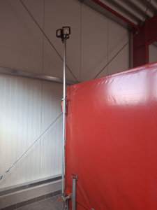 Feuerwehr Logistikanhänger mit 4 Rollcontainer ohne Beladung und Rundumleuchte.