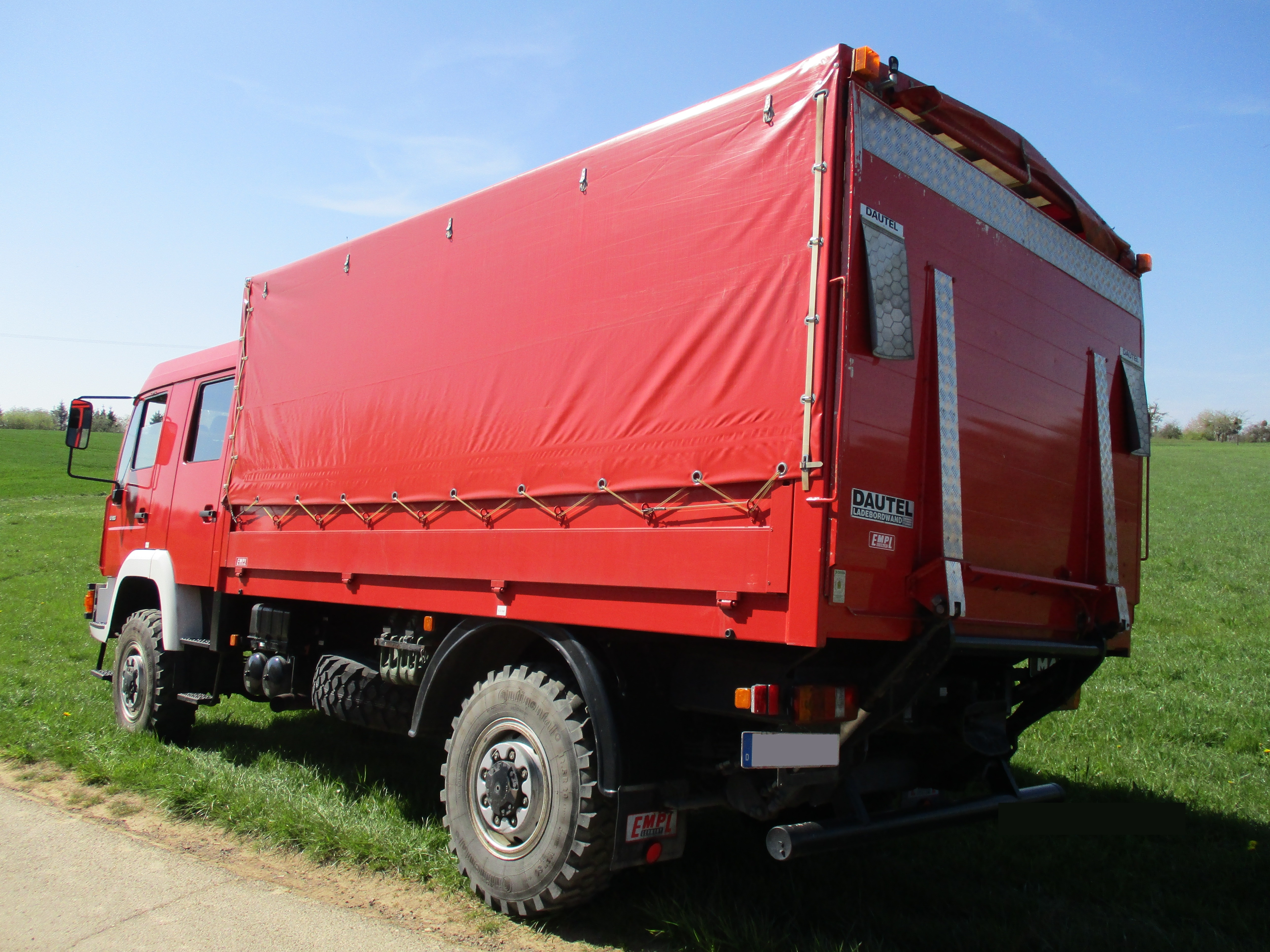 GW-L2 auf MAN 10.163 Doppelkabine 4x4 Km-Stand ca. 44.000 Leergewicht; 6.350 kg Gesamtgewicht; 10.500 kg Ggf. ist eine Ablastung auf 7,49 t möglich Mannschaftskabine 1/5 Besatzung Standheizung 4x4 Ladebordwand 1.000 kg Ladungssicherungsschienen für bis zu Ca. 8-10 Rollwagen (EURO Paletten Maß) Mannschaftskabine mit aufklappbarer Feuerwehrsitzbank Ohne Beladung, ohne Garantie, Zwischenverkauf, irrtümliche Angaben, alle Rechte vorbehalten. Preis auf schriftliche Anfrage der Verwaltung! Eine Besichtigung ist "nur" nach Terminabsprache möglich. 02.10.2025 Anzeige-Nr.: 99049 | |||