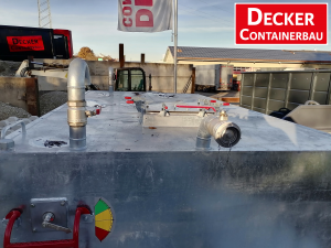 Wassertank 11m³ mit Plattform vorne, Sonderbau ab Lager 84427 St.Wolfgang verfügbar, Zwischenverkauf vorbehalten Abrollbehälter nach DIN 14505 Standardausstattung: -Unterrahmen INP 180, verstärkt -6100 mm lang -Hakenhöhe 1570mm -Aufnahmebügel 60 mm -C-Verriegelung -Außenrollen aus Polyamid, abschmierbar und wechselbar -Außenrollen ganz nach hinten gesetzt wegen der Wasseranschlüsse -UVV geprüft DIN 30722-1 (15.000 kg) Aufbau: vorne: -Plattform aus Stahlblech glatt, 5mm stark mit leichtem Unterrahmen, Antirutschbeschichtet Länge 1800mm Breite 2500mm Belastbarkeit 800 kg/m² Geländer - es kommt dazu eine Skizze -hinten -Tank 11 m³ Volumen, exakte Höhe ermittelt sich durch das Volumen -4300 mm lang -2300 mm breit -ca.1100mm hoch -Boden 5mm -Wandstärke 3mm -2 Schwallwände -1 St. Leiter/Aufstieg vorne rechts -1 St. Domdeckel/Einstieg Zusatzausstattung Tank: -1 St. Befüllanschluss der Größe Storz B mit Kugelhahn und Deckel vorne oben mittig -1 St. Entlüftung mit Kugelhahn vorne -1 St. Entlüftung mit Kugelhahn hinten -1 St. Auslauf/Sauganschluss der Größe Storz A mit Kugelhahn und Deckel vorne unten mittig, aber 400mm nach rechts versetzt -1 St. Auslauf/Sauganschluss der Größe Storz A mit Kugelhahn und Deckel links hinten unten -1 St. Auslauf/Sauganschluss der Größe Storz A mit Kugelhahn und Deckel rechts hinten unten - Füllstandsanzeige vorne rechts Korrisionsschutz: -Tank entfettet und gestrahlt -innen grundiert mit Epoxy Lackierung 80 µm -außen grundiert mit Epoxy Lackierung 50 µmZusatzausstattung: Farbgebung: -2K Lackierung außen im Farbton RAL 3000 Feuerrot ab Lager 84427 St.Wolfgang verfügbar -Zwischenverkauf vorbehalten- Zahlungskonditionen: 100% vor Verladung. Die Ware bleibt bis zur vollständigen Zahlung unser Eigentum. Es gelten unsere Allgemeinen Geschäftsbedingungen. Angebot ist freibleibend ohne Gewähr und Garantie. Sehr gerne erstellen wir Ihnen ein unverbindliches Angebot. Unser komplettes Produktangebot finden Sie auf decker-containerbau.com 05.12.2025 Anzeige-Nr.: 99631 | |||