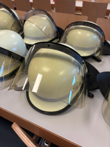 Verkauft werden 8 Schuberth Feuerwehrhelme Typ F120 Pro, Classic Leder komplett mit Kunstoffvisier (verstellbar) und Leder-Nackenschutz. Abgabe wegen Umstellung auf anderes Modell. Alle Helme haben leichte, gewöhnliche Gebrauchsspuren an der Oberfläche (siehe Fotos), sind abgesehen davon aber in einem top Zustand. Innenleben und Riemen sind in einem super Zustand. Die Helme sind voll einsatzbereit.