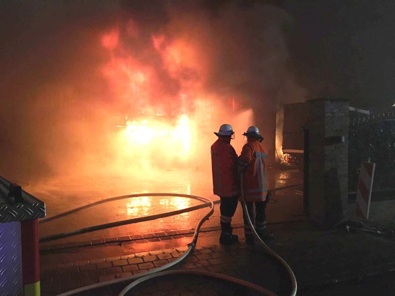 Die Ortswehr Schiffdorf traf als erstes an der Einsatzstelle ein und begann umgehend mit der Brandbekämpfung. Da das Wohnhaus und die ca. 320m² große Lagerhalle über eine Garage miteinander verbunden waren, wurde zügig eine Riegelstellung aufgebaut um ein Übergreifen des Feuers zu verhindern. Die Halle selbst, in der neben zahlreichen Baumaterialien auch ein LKW sowie ein Gabelstapler untergebracht waren, war nicht zu halten und stand innerhalb kurzer Zeit im Vollbrand.