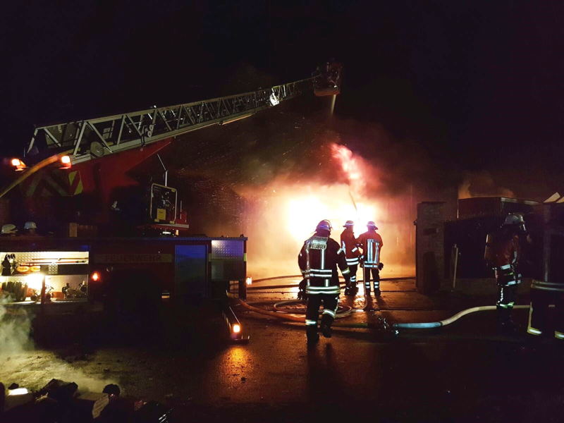 Die Ortsfeuerwehren Schiffdorf, Bramel und Sellstedt wurden am 01.01.2017 um 01:58 Uhr zu einem Lagerhallenbrand in der Straße Im Gewerbepark in Schiffdorf alarmiert. Ein Nachbar hatte das Feuer entdeckt, die Feuerwehr gerufen und anschließend die Bewohner des an die Halle angrenzenden Wohnhauses auf das Feuer aufmerksam gemacht. Ein Versuch den Brand mittels Feuerlöscher zu löschen scheiterte.