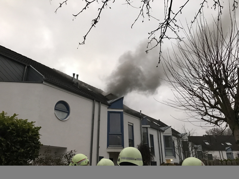 Die Feuer- und Rettungsleitstelle des Rheinisch-Bergischen Kreises wurde um 16:18 Uhr per Notruf 112 über eine starke Rauchentwicklung aus einem Dachstuhl eines Reihenmittelhauses im Stadtteil Hebborn von Bergisch Gladbach informiert. Die Leitstelle entsandte umgehend die beiden hauptamtlich besetzten Feuerwachen Nord und Süd sowie die beiden ehrenamtlichen Löschzüge Stadtmitte und Paffrath/Hand, den Einsatzführungsdienst (B-Dienst) und den Rettungsdienst der Feuerwehr Bergisch Gladbach an die Einsatzstelle. Bereits vor Eintreffen der Feuerwehr konnten beherzt helfende Anwohner zwei Bewohner des Hauses mit Hilfe einer Haushaltsleiter aus dem stark verrauchten Gebäude aus dem 1. Obergeschoss retten. Eine sichere Flucht ins Freie war den beiden Bewohnern offensichtlich aufgrund des Brandrauches im Gebäude nicht mehr möglich. Die beiden Bewohner wurden umgehend vom Rettungsdienst vor Ort behandelt und mit mittelschweren Verletzungen in ein örtliches Krankenhaus verbracht. Die weitere Erkundung ergab, dass es in der Küche im Erdgeschoss zu einem Feuer gekommen war, wodurch sich dichter Brandrauch im kompletten Gebäude ausgebreitet hatte. Das Feuer in der Küche wurde durch einen Angriffstrupp der Feuerwehr unter Atemschutz schnell gelöscht. Der tiefschwarze Brandrauch im Gebäude war bereits erheblich thermisch aufgeheizt und hat im gesamten Gebäude erheblichen Schaden verursacht. Die Entrauchung des Gebäudes wurde unter Einsatz eines Hochleistungslüfters und Öffnung eines Dachflächenfensters durchgeführt. Das Haus ist aufgrund des Brandereignisses unbewohnbar. Die Feuerwehr Bergisch Gladbach war mit 15 hauptamtlichen und 35 ehrenamtlichen Brandschutzkräften sowie 5 Rettungsdienstkräften vor Ort. Der Leitungsdienst (A-Dienst) machte sich ein Bild der Lage vor Ort. Der Stördienst der RheinEnergie schaltete das Gebäude stromlos und trennte die Gasversorgung.