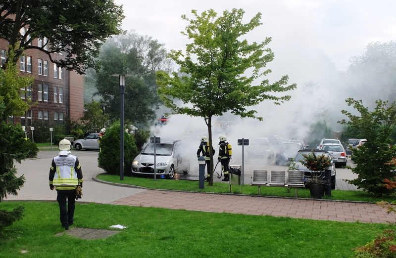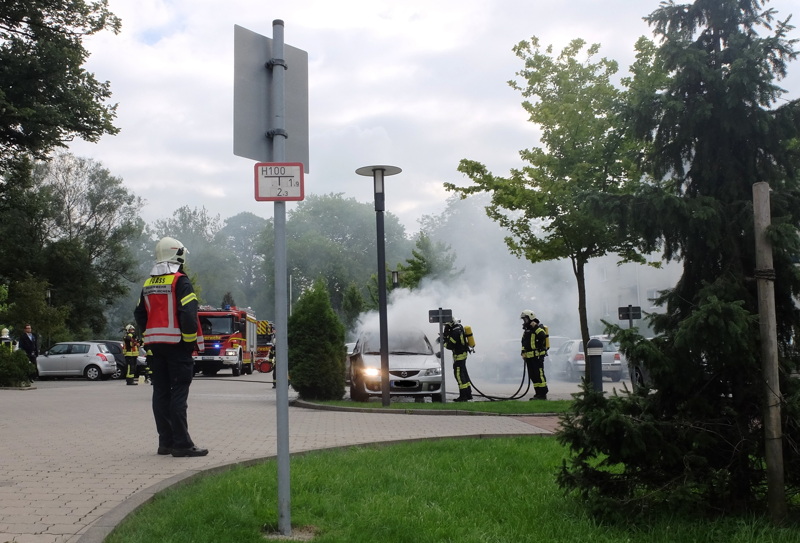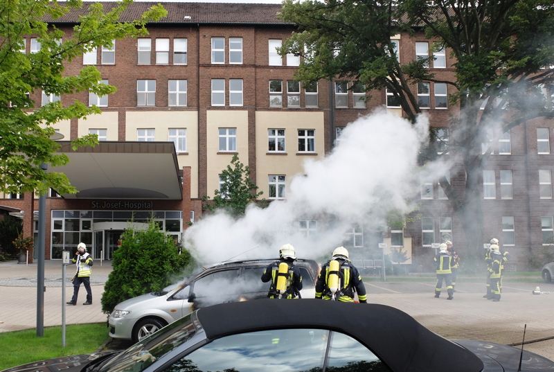 Vor Ort stellte sich die Lage jedoch weniger dramatisch dar. Auf dem Parkplatz vor dem Haupteingang stand ein PKW in Vollbrand. Passanten, die dies bemerkten, rannten umgehend zum Hauptgebäude und schlugen den Handfeuermelder im Foyer ein. Die Einsatzkräfte der Feuerwehr löschten den PKW Brand mit einem Strahlrohr unter Atemschutz ab. Parallel wurden die Gebäudeteile des Krankenhauses auf Raucheintritt überprüft. Es bestand jedoch keine Gefahr für Personen im Krankenhaus, da der Brandrauch nicht ins Gebäude eindrang.