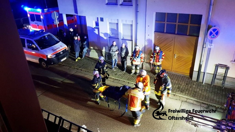 Bereits um 0:11 Uhr am 01.01.18 wurde die Hilfe der FFOftersheim angefordert. Der Rettungsdienst forderte die Feuerwehr zu Unterstützung bei der Rettung eines Notfallpatienten an. Ebenfalls wurde die Drehleiter der FFSchwetzingen alarmiert. Eine Person wurde dann aber mit einer Spezialtrage der Feuerwehr durch den Treppenraum auf Bodenniveau transportiert.