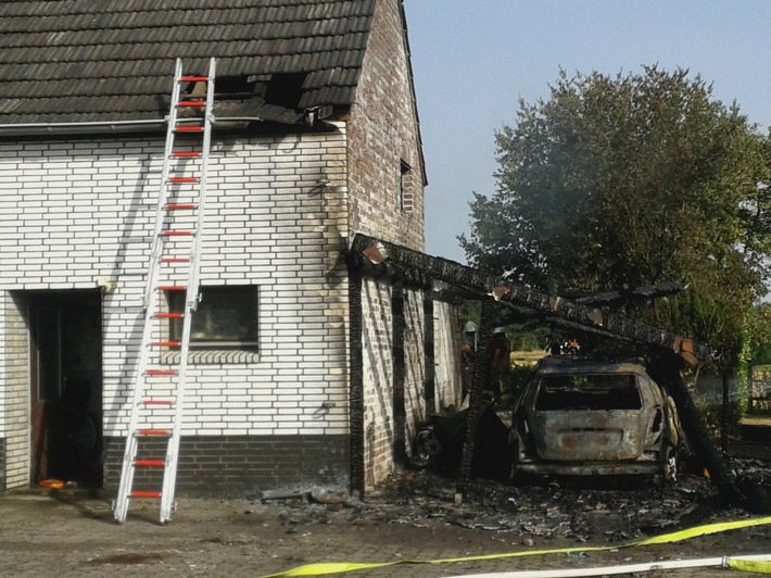 Dieses Szenario entpuppte sich letztlich jedoch als ausgedehnter Wohnhausbrand im Kempener Ortsteil Tönisberg, zu dem zeitgleich auch die Kempener Wehr mit mehreren Einheiten ausgerückt war. Bei Eintreffen der Feuerwehr brannte es bereits im Dach eines Wohnhauses an der Straße Neufeld. Das Feuer erstreckte sich zu diesem Zeitpunkt schwerpunktmäßig auch auf einen angebauten Carport, einen dort abgestellten PKW sowie die angrenzenden Garten- und Böschungsflächen.