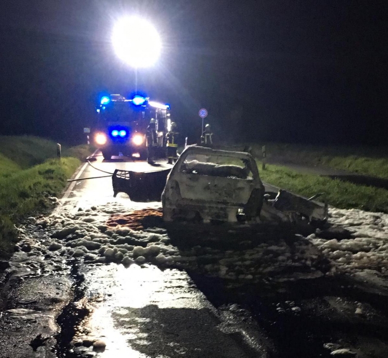 Der brennende PKW wurde durch die Einsatzkräfte mit Löschschaum abgelöscht. Durch den Brand und auslaufende Kraft- und Betriebsstoffe wurde die Fahrbahn beschädigt, so dass die Straße mindestens bis in die Morgenstunden gesperrt bleibt.