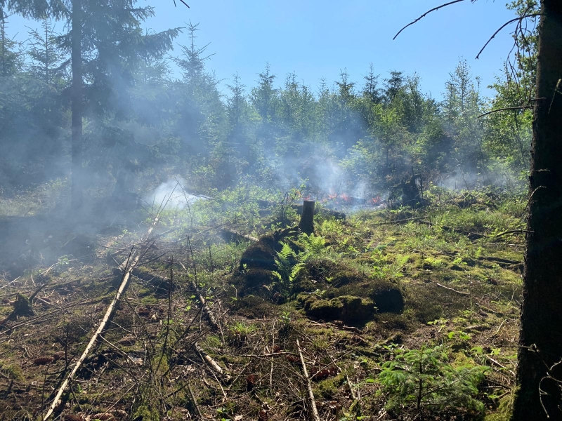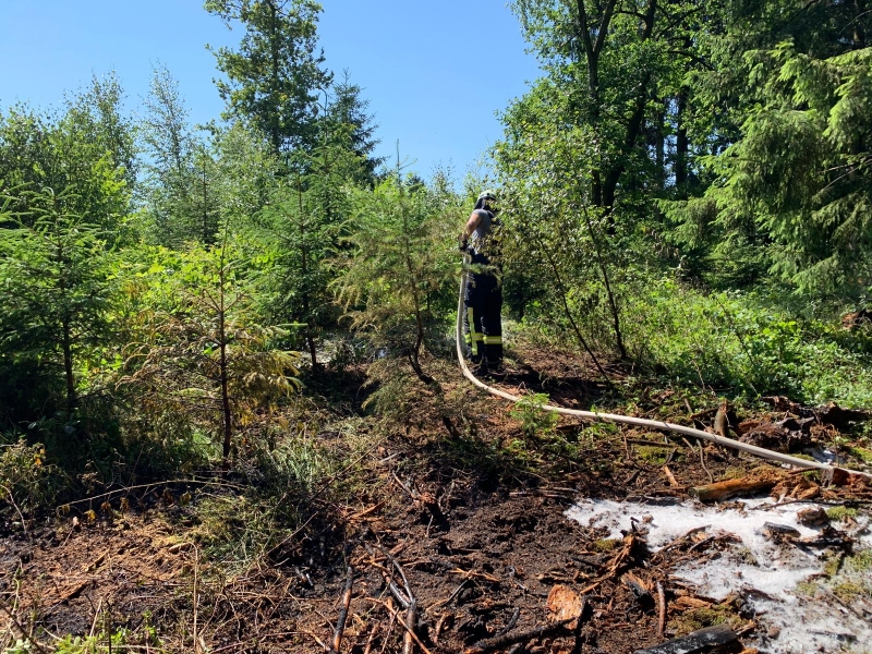 Umgehend wurden daraufhin weitere Einsatzkräfte zur Einsatzstelle nachalarmiert, um frühzeitig die Wasserversorgung sicherzustellen. Auf einer Fläche von rund 100 Quadratmetern brannten der Waldboden und bereits erste kleine Tannen. Aufgrund der aktuellen Trockenheit und dem Wind auf der Höhenlage, breitete sich das Feuer schnell aus.