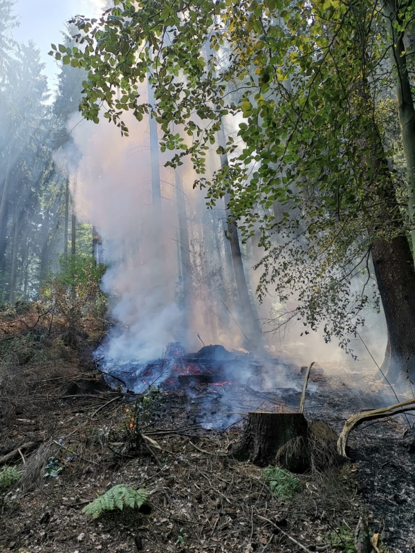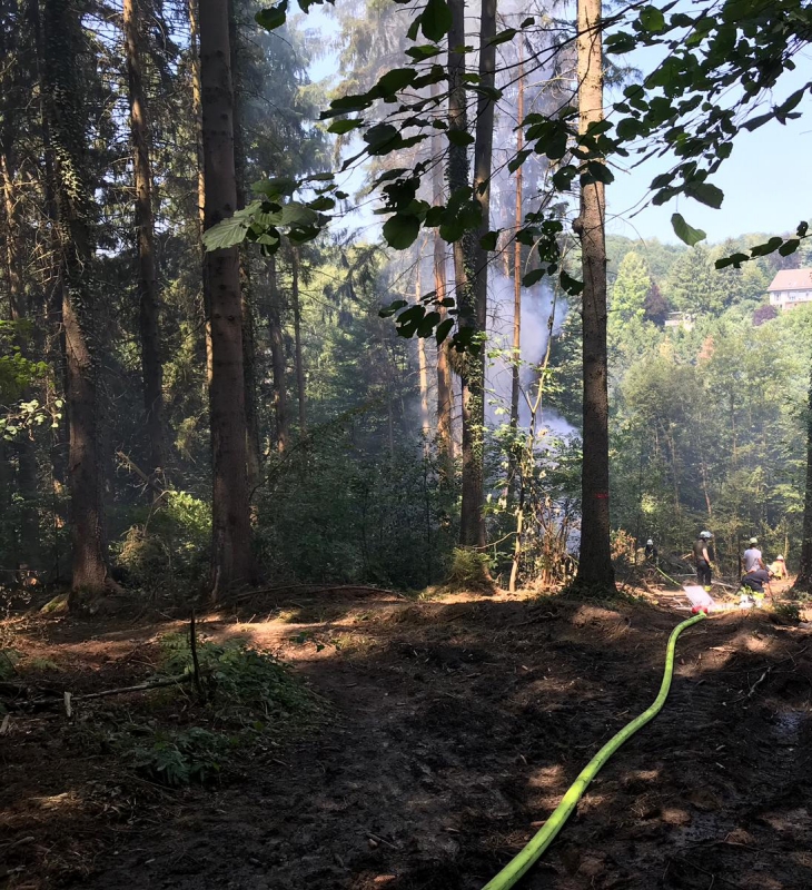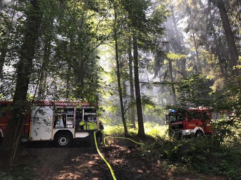 Durch die sofort eingeleiteten Löschmaßnahmen konnte das Feuer schnell eingedämmt werden. Mittels Dunghaken wurde der Waldboden aufgebrochen und letzte Glutnester abgelöscht. Anschließend wässerten die Einsatzkräfte die Brandstelle ausgiebig und kontrollierten den Bereich mit der Wärmebildkamera.