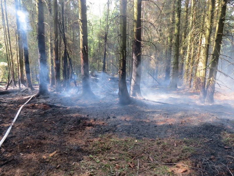 Die Brandstelle konnte schließlich in einem Fichtenbestand in Nähe zu den Ortslagen Schlausenbach und Auw bei Prüm ausgemacht werden. Der Brand hatte sich zu diesem Zeitpunkt bereits auf einer Fläche von rund 2000 Quadratmetern ausgebreitet.