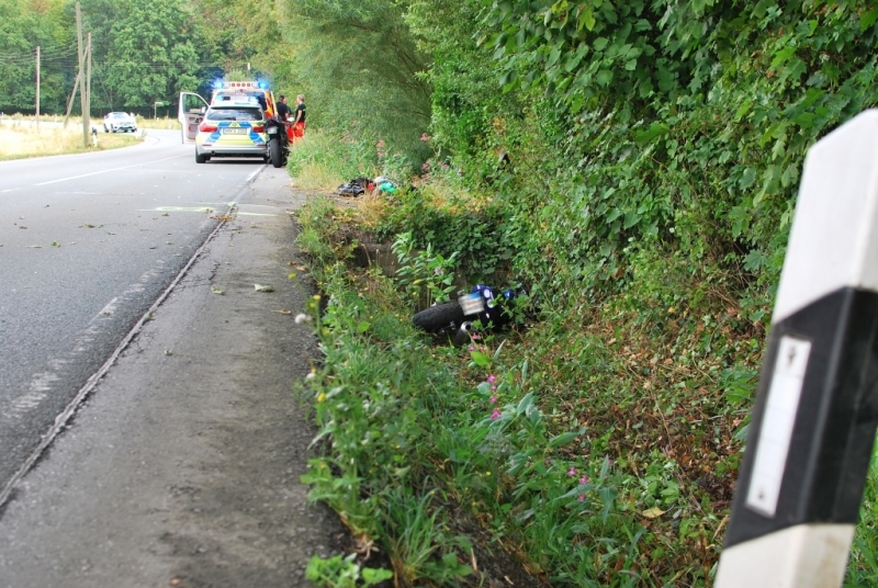 Auf der Drüpplingser Straße ereignete sich in der Mittagszeit ein Verkehrsunfall unter Beteiligung einer Motorradfahrerin. Nach ersten Erkenntnissen touchierte sie einen PKW, verlor die Kontrolle über ihr Zweirad und stürzte in den tiefliegenden Straßengraben. Hierbei zog sich die 47-Jährige schwere Verletzungen zu und musste mit dem Rettungshubschrauber "Christoph 8" in die Unfallklinik nach Dortmund transportiert werden. Ein unbeteiligter Zeuge, der das Unfallgeschehen miterlebt hatte, erlitt einen Schock und wurde in ein Iserlohner Krankenhaus gebracht. Die Bundesstraße war für gut 1,5 Stunden für den Verkehr gesperrt worden, was für einen größeren Rückstau sorgte.