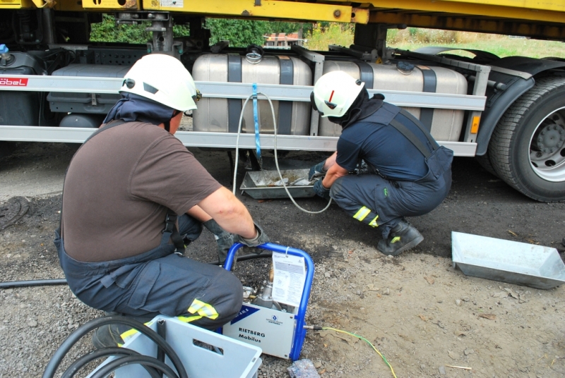 An einem hochstehenden Kanaldeckel riss sich heute Nachmittag der Fahrer eines LKWs den Dieseltank auf. Schätzungsweise 50l Dieselkraftstoff traten aus, ergossen sich auf der unbefestigten Fläche unter dem LKW und versickerten teilweise im Boden. In die Kanalisation gelangte glücklicherweise nichts. Der Dieseltank konnte durch die Einsatzkräfte der Feuerwehr mit einer Dichtmasse provisorisch abgedichtet werden. Kraftstoff wurde aufgefangen und mit einer speziellen Pumpe in ein bereitgestelltes Fass umgepumpt. Die Untere Wasserbehörde des Märkischen Kreises war ebenfalls alarmiert worden und veranlasste die Entsorgung des mit Diesel kontaminierten Bodens durch eine Fachfirma. Die Feuerwehr, die mit rund 35 Kräften im Einsatz war, konnte den Einsatz um kurz vor 19:00 Uhr beenden.