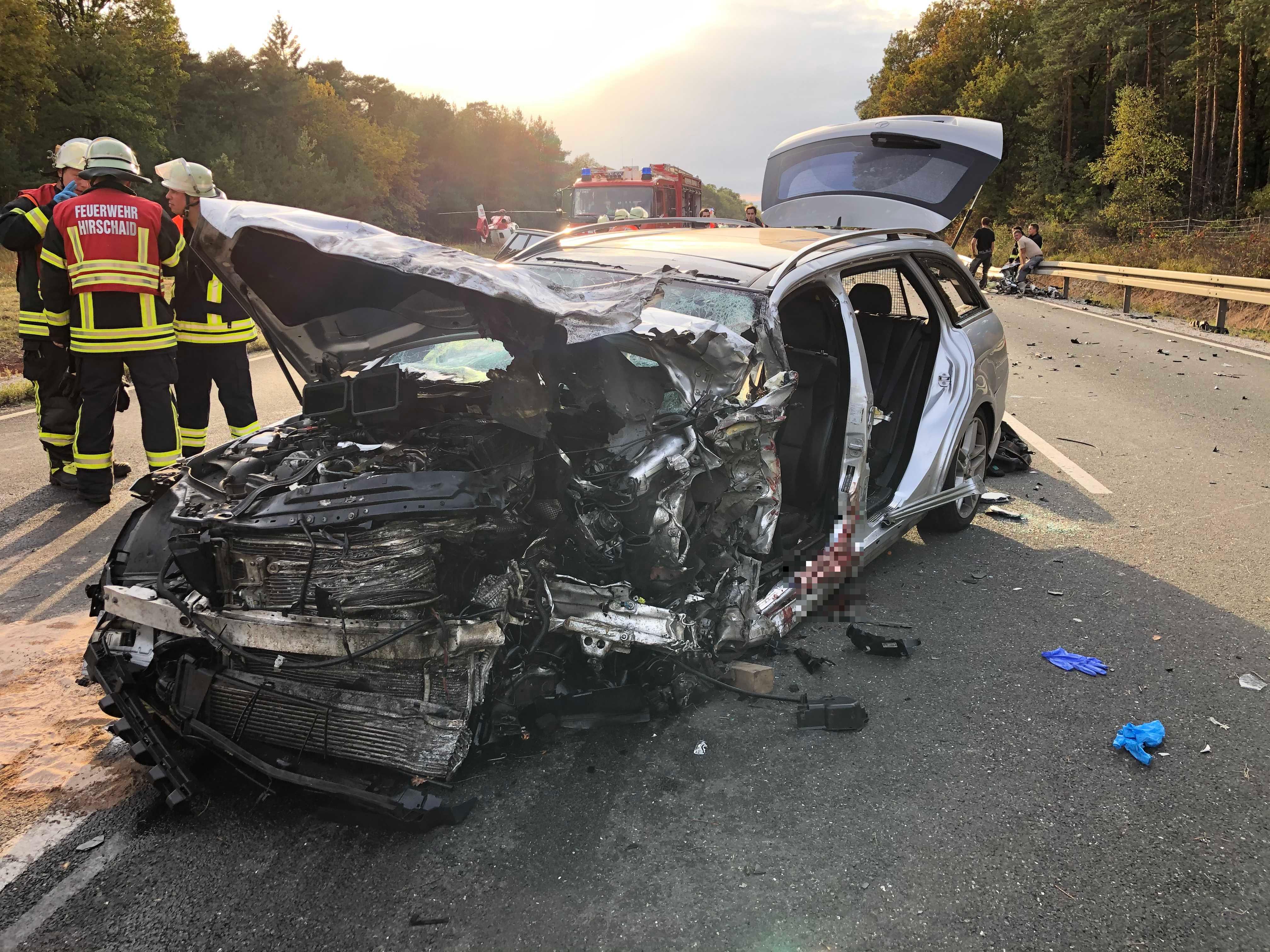 Gegen 16:30 Uhr überholte ein Pkw Mercedes (mit drei Personen besetzt) im absoluten Überholverbot ein bislang unbekanntes Fahrzeug und kollidierte in der Folge zunächst mit einem entgegenkommenden Renault (besetzt mit drei Personen) und im Anschluss mit einem Nissan (besetzt mit einem Ehepaar und deren fünf Kindern im Alter von 1 bis 12 Jahren). Ein weiteres entgegen kommendes Fahrzeug, ein Mercedes Sprinter, kollidierte ebenfalls mit dem Unfallverursacher. Bei dem Frontalzusammenstoß mit dem Nissan überschlug sich dieser und blieb auf der Seite liegen. Die teils eingeklemmten Personen mussten von der Freiwilligen Feuerwehr Hirschaid aus dem Fahrzeug befreit werden.